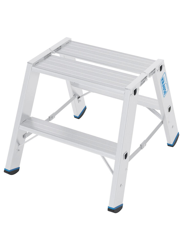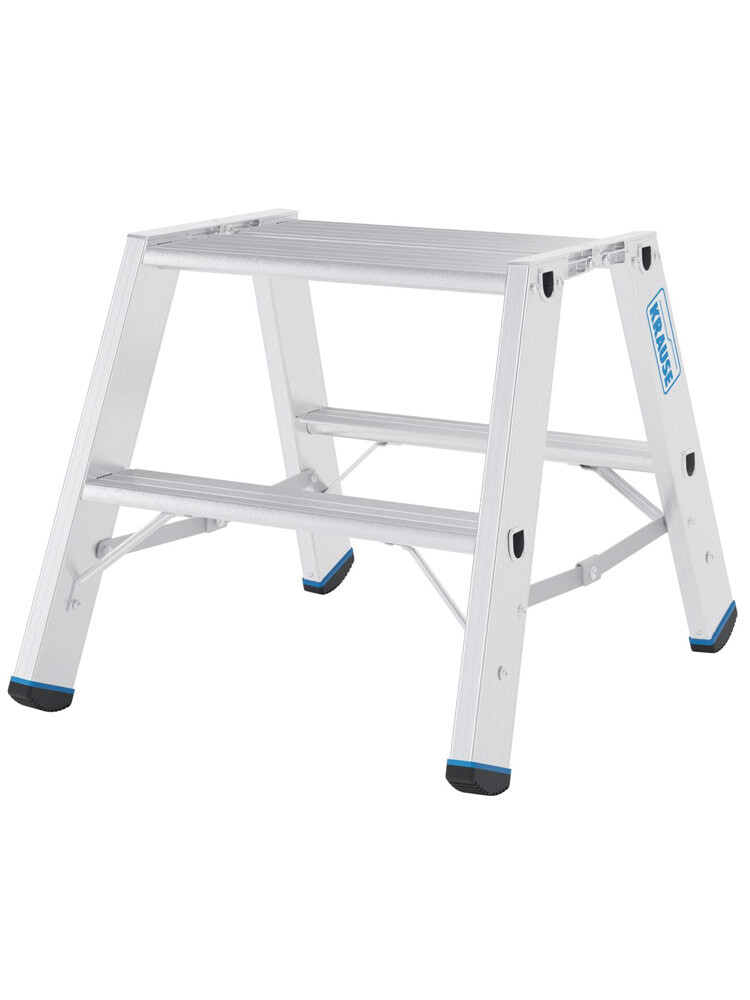 Szerokie i wytrzymałe schodki dwustronne z serii profesjonalnej Krause. Posiadają dużą górną platformę oraz stopnie o głebokości 80mm